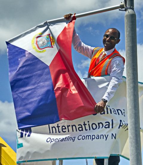 Robert Brown, Director of Special Projects at SXM proudly hoists the St. Maarten flag. (SXM photo)