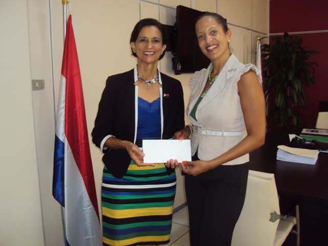Caption: The Prime Minister of St. Maarten the Honorable Sarah Wescot-Williams presented a personal check to Erika Cannegieter of the Be the Change Foundation in Support of the Art Saves Live program. The Prime Minister, in presenting the check, again commended the organizations and encouraged businesses and individuals to contribute to the Be the Change Foundation as they raise funds for many worthwhile organizations on St. Maarten.