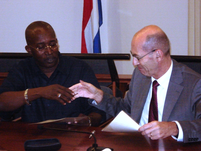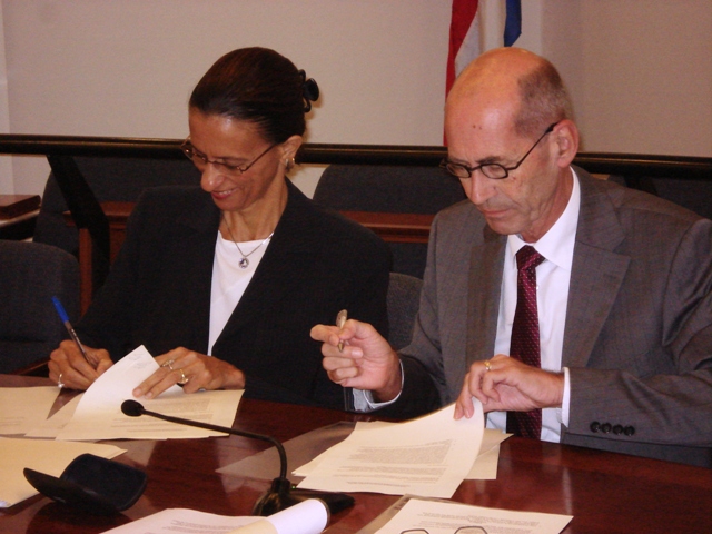 Commissioner Wescot-Williams and the Representative of the Netherlands in the Netherlands Antilles, Mr. Rob Vermaas, signed the Implementation Protocol of the Social and Economic Initiative (SEI) in St. Maarten today. On this occasion, the protocol of the Cooperation Program Institutional Strengthening and Reinforcement (ISR) 2008-2012 was also signed by Commissioner Roy Marlin and the Representative of the Netherlands at the Administration Office in Philipsburg.The Netherlands has reserved a total of 26 million guilders in the Transition Agreement of February 2007 for the St. Maarten SEI. As St. Maarten also wants to deploy part of the regular cooperation funds for the implementation of the SEI in the coming years, the total Dutch contribution to the SEI is 32 million guilders. The Island Territory of St. Maarten, too, will contribute in all another 26 million guilders. For the St. Maarten ISR Program 2008, the Netherlands will make more than 8.5 million guilders available.