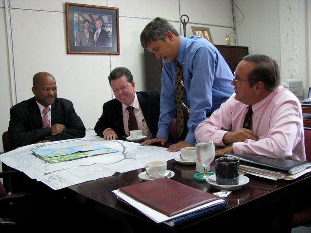 Commissioner Theo Heyliger held a meeting to discuss the possibilities of the St. Maarten Housing Developemnt Foundation and Postspaarbank working together on current developments with Minister of Traffic and Transportation M. Adriaens. Also present in the meeting were Daniel Hodge, Managing Director of Postpaar Bank and Michael Fowler Managing Director of SMHDF.