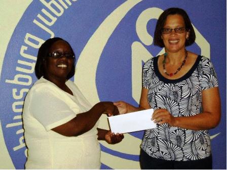 In the picture is President of Federation Antillean Youth Care, Ms. Dulyn Brooks (left), presenting the annual subsidy check to Mrs. Monique Alberts(right), Directress of the Library