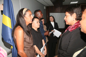 WILLEMSTAD — The first six temporary residence permits according to the Brooks Tower-agreement (BTA) had been issued in the large conference room of the Board of Governors Friday morning.