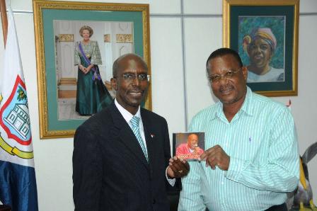 In one of his last acts as Governor of the Island Territory of Sint Maarten prior to traveling to Holland on government business and taking a well-deserved vacation at the end of May, Governor Franklyn Richards was presented with a complimentary music CD from calypsonian King Jacko.