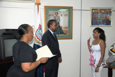 Assistant Pharmacist Miss. Seelta Khoenkhoen confirm the oath of office in front of Lt. Gov. Mr. Reynold Groeneveldt after it was read to her by Miss.Ligia Stella.