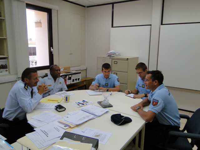In regard to the many recent serious criminal investigations and increase in different criminal activities taking place on the French and Dutch Side of the Island, a very important meeting was held at the Philipsburg Police Station Monday morning between the Commander of the Gendarmes, Major Stephane Brunet assisted by captain Antoine Cuignet and Colonel Jean Pierre Chenel and the Chief of Police from the Dutch side Commissioner Peter de Witte assisted by the deputy Chief of Police Commissioner Carl John.