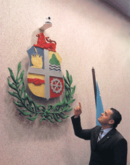 ORANGE CITY – State President Paul Croes (AVP), lets the new cameras in parliament see shots of debates in the States to broadcast. One of the cameras is right over the arms of Aruba and the President’s Chair.