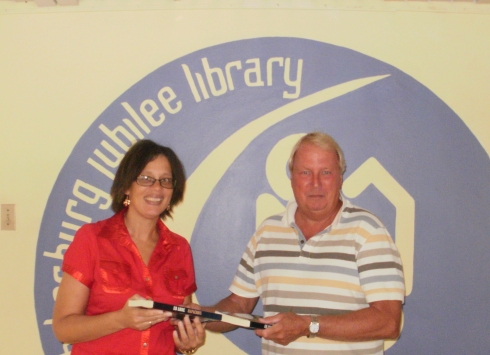Ed Arre presented copies of his book to, the directress of the Philipsburg Jubilee Library, Mrs. Monique Alberts.