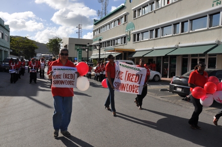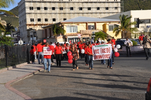 The march took place on Thursday, March 31st at 4:00 pm. It started in front of NAGICO, proceeded around town and ended at the Government building where a very short ceremony was held. During this ceremony, NAGICO handed over the RED campaign to the Airport and also presented the AIDS Foundation with a donation to aid in their worthwhile efforts.