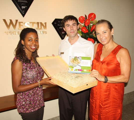 The resort representatives were thrilled with the gift, "especially the new St. Martin cook book by Yvette Hyman," said Shujah Reiph, BFC coordinator. The BFC thanked Westin for its gracious hospitality and fine accommodations in hosting Nobel Laureate Derek Walcott, the keynote speaker at the 9th annual St. Martin Book Fair (6/2/11). Westin reservations manager Marc LeBlanc extended his "heartfelt thanks" and said that Westin appreciated "the kind gesture, and we hope to assist you once again in the future." St. Martin Talk, White Egrets, and Brotherhood of the Spurs were also included in the gift box.