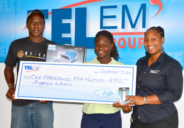 Angelique picked up her prize at TelEm Group’s Pond Island main office Monday, along with her father, Mr. Luc Warno.