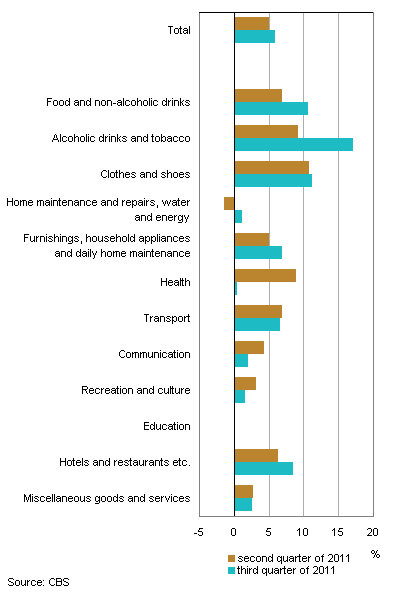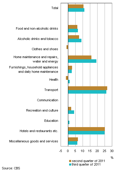 On Bonaire inflation rose from 5.0 percent in the second quarter to 5.9 percent in the third quarter. This increase was mainly caused by higher food prices. Compared to the same period last year, prices of food and non-alcoholic beverages were 10.6 percent higher. Price developments of home maintenance and repairs, water and energy also contributed to the inflation increase as the effect of a price decrease in the third quarter of 2010 has now worn off.