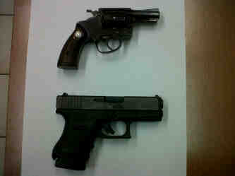 On the scene the patrol located the car in question. When the driver of that car saw the police approaching he stepped out of the car with the intention to walk away, however he was ordered to stand still, which he complied with. The patrol also noticed another man sitting in the front passenger-seat of that car. This man was also ordered to step out of the car. During a search of the car one pistol of the brand GLOCK caliber .45 and one revolver of the brand INA NAC (Brasil) caliber .38 were found on the passenger-seat. Both suspects with initials J.R. (21) and A.J. (24) both from Sint Maarten were arrested on the spot. The two handguns were confiscated for further investigation. During a search of both suspects small plastic bags containing an amount of marihuana were also found and confiscated. The suspects were taken to the police station were they remain in custody for further investigation. At the police station the officers learnt that arrest warrant for the suspect J.R. had been issued, as a suspect in an ongoing armed-robbery investigation.