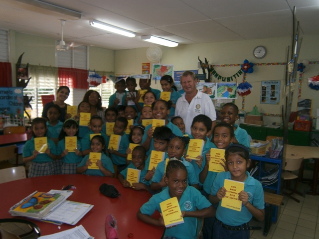 The Rotary Club of St. Maarten through a very special arrangement receives the dictionaries from a donor in an effort to make a positive impact in promoting literacy. The third grade students receive the dictionaries at this particular time in their formal education as most primary schools teach the children to use an English dictionary in the third grade. With the donation of the dictionaries to the students directly, each student is the proud owner of what is often their first dictionary and because they are also able to take it home with them it allows the entire family to benefit.