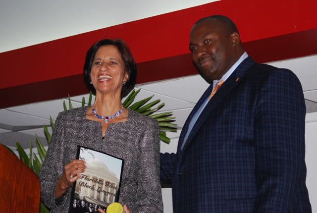 69th President of the National Bar Association Daryl D. Parks presents Prime Minister Hon. Sarah Wescot-Williams (left) with a book entitled "Florida’s First Black Lawyers."