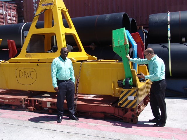 Harbour CEO Mark Mingo and Terminal and Cargo Operations Manager Roger Lawrence inspect "Dave" – the new container spreader.