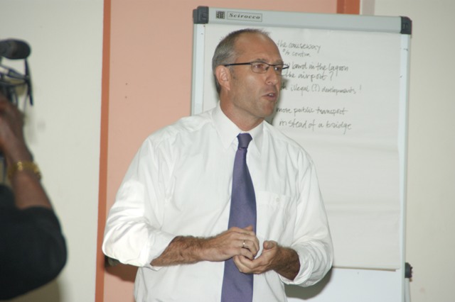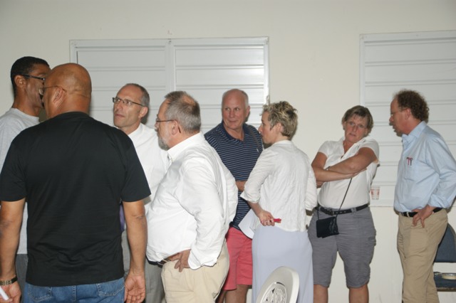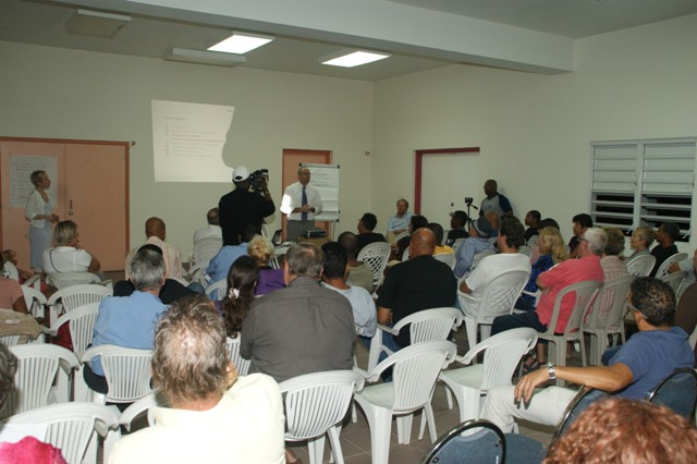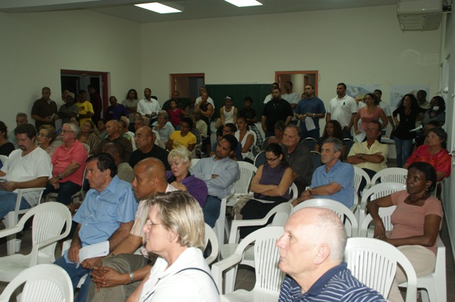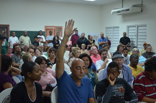 During the town hall meeting, the residents were asked to raise their hands to vote in favor of the planned project and bridge for Simpsonbay. In the picture above, the man in the front row was the only person in favor of the project.