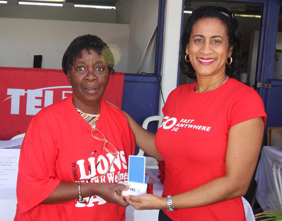 The first guest to receive her prize of a T-shirt and a TelCell pre-paid card was Ms. Ursula Boasman.