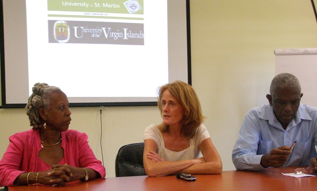 Photo Outline:The rekindling of the relationship between the University of St. Martin (USM) and the University of the Virgin Islands (UVI) was lauded on Thursday by both the USM President Annelies van den Assem (c ) and the UVI Vice Provost Dr. Judith W. Edwin (l). This comes on the heels of the plans by the institutions to jointly offer the Masters in Education and Bachelor in Business Administration programs again. Also in the photo (r ) is USM Acting Dean of Academics Glen Yeung.