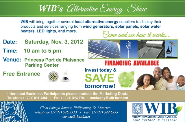 The Windward Island Bank will be hosting our very first Alternative Energy Show at the Princess Port de Plaisance parking facility for the general public. The event will take place on the November 3rd 2012 from 10am to 5pm.