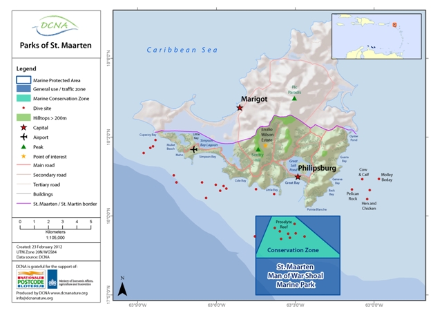 The Man of War Shoal Marine Park includes globally threatened coral reef as well as seagrass ecosystems. The marine Park is a home and migratory stop over or breeding site for 3 IUCN Red List Species, 10 CITES Appendix I species and 89 Appendix II species, all of which range from Critically Endangered or Endangered. The St. Maarten Nature Foundation manages the Man of War Shoal Marine Park.