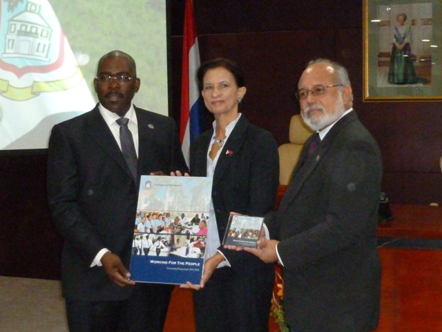 PHOTO CUTLINE: L to R, President of Parliament Hon. Rodolphe Samuel, Prime Minister Hon. Sarah Wescot-Williams, and Secretary General Jossy Semeleer holding copies of the Governing Program.