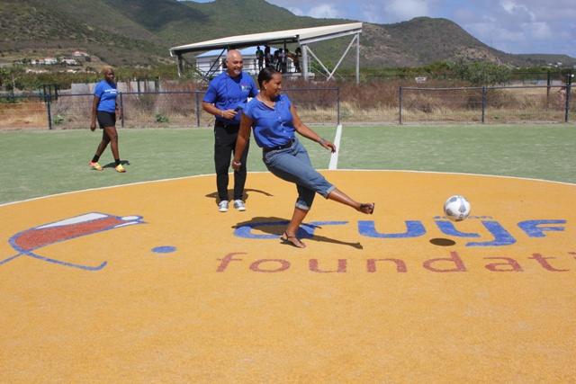 PHOTO CUTLINE: Minister Hon. Silveria Jacobs does the official kick-off of the game.DCOMM Photo