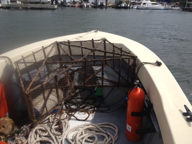 Caption: A removed fish trap on the Nature Foundation Marine Park Patrol Vessel Yellowtail