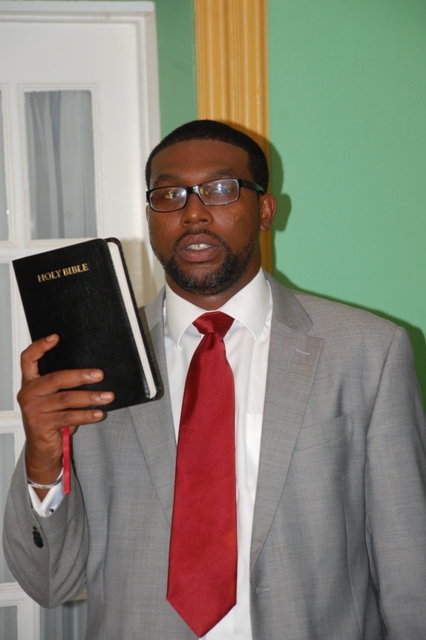 Photo 1 – Attorney General of St. Kitts and Nevis, Hon. Jason Hamilton taking the Oaths of Office and Allegiance.