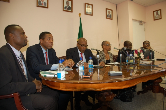 Photo No. 2 . – Members of the Cabinet at the Press Briefing last week (left to right) – Hon. Nigel Carty; Hon. Glenn Phillip; Hon. Dr. Earl Asim Martin; Hon. Marcella Liburd; Hon. Patrice Nisbett and Hon. Jason Hamilton