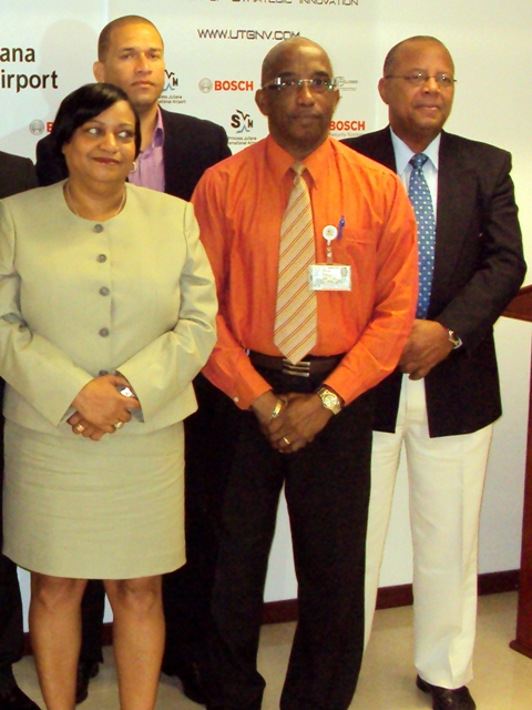 At the press conference were Justice Minister Roland Duncan, PJIAE Managing Director, Regina La Bega, Deputy Chairman of the Supervisory Board of Directors of PJIAE, Marion Matser and member Cleavland Beresford, as well as top executives of the St. Maarten Chamber of Commerce, and directors and other staff of PJIAE.
