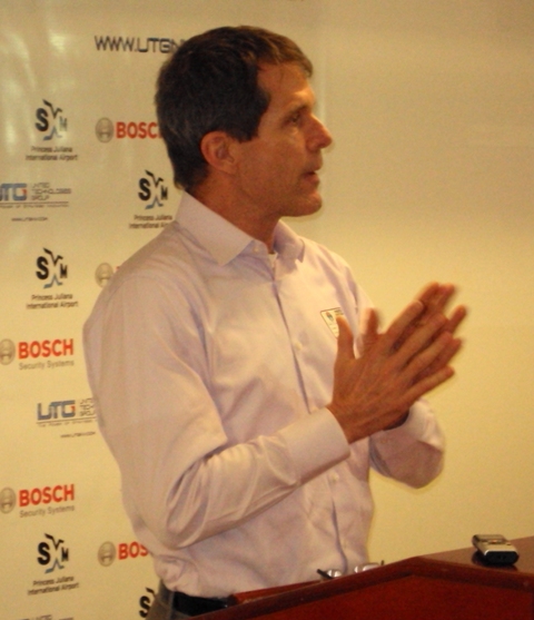 Photo Caption2: Bosch engineer and trainer, Scott Glidden, addressing the press conference (2/27/13). (SXM Airport photo)