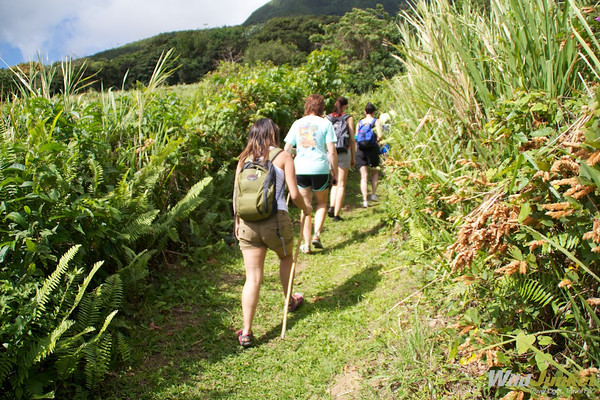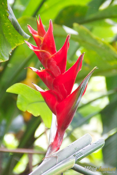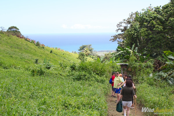 We continued up the walking trail past farm lands and into the start of the rainforest, evident from the lush foliage and wet, humid climate. The temperature dropped to a comfortable level and the tree canopy provided natural shade. We found ourselves pushing past tall palm trees, thick bamboo thickets, emerald green elephant ear fronds and banyan roots hanging from the treetops. Beautiful bright red heliconia, yellow bell and purple hibiscus (St. Kitts’ national flower) all dangled from the branches, adding a touch of colour to the forest. Hummingbirds flew overhead, curiously sussing us out from a distance.