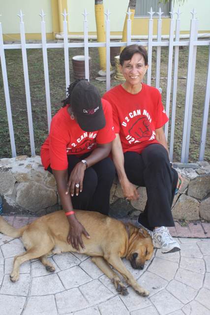 During the early morning fitness walk as part of International Women’s Day participants were surprised by a brown dog, of local St. Maarten Stock, who followed participants from the beginning of the March all the way to the Government Administration Building. Due to the dog’s dedication and participation in the walk he has been dubbed the (un)official U 2 Can Move Mascot. In the photo is the mascot with the PM and Dr. Ro