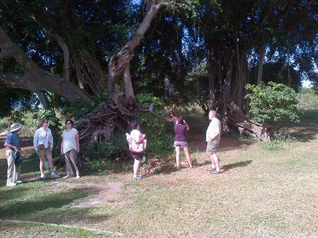 Photo 1 – Cruise passengers look at the 350-year-old Banyan tree in the Shadwell Great House. (photo by Erasmus Williams)