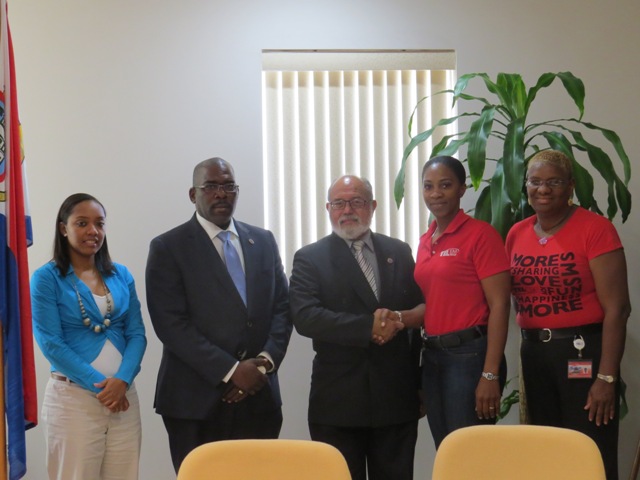 Secretary General of Parliament, Mr. J.D. Semeleer (center) shakes hands with TelEm Group Senior Account Manager, Lucrecia Lynch, (2nd right) Friday, after signing an agreement to provide fiber optic services to the Parliament Building. President of Parliament, Drs. Rudolph Samuel (2nd left), who initiated the project, was present, along with Deputy Secretary General, Nancy Joubert (left) and TelEm Group Account Manager, Cherrelyn Jermain (right).