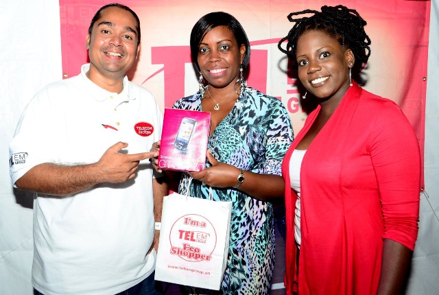 Prize-winner Ursel Biabiani (center) scooped the Samsung phone and 3G service prize from TelEm Group’s Suraj Ramdas(left) and Angel Richardson(right) for participation in the Orange dance event at the St. Rose Arcade "Road to Carnival" event Thursday evening.
