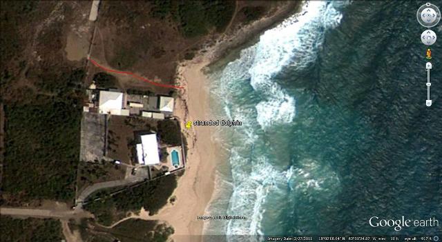 Caption:Location of stranding: Guana Bay Beach NORTH Coordinates: 18.02’05.25" N 63.01’22.75" W