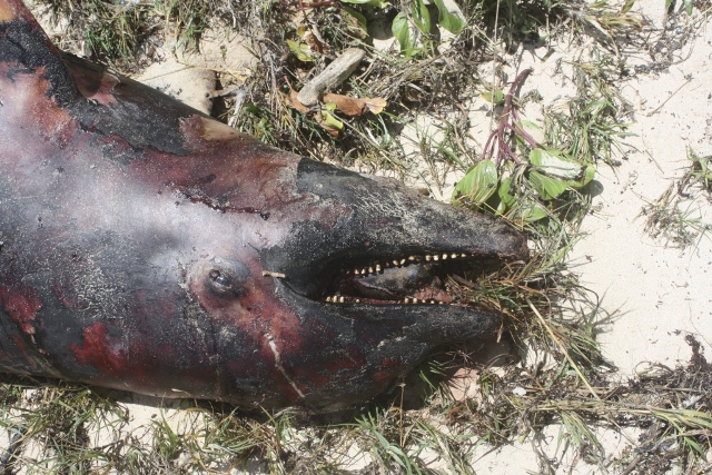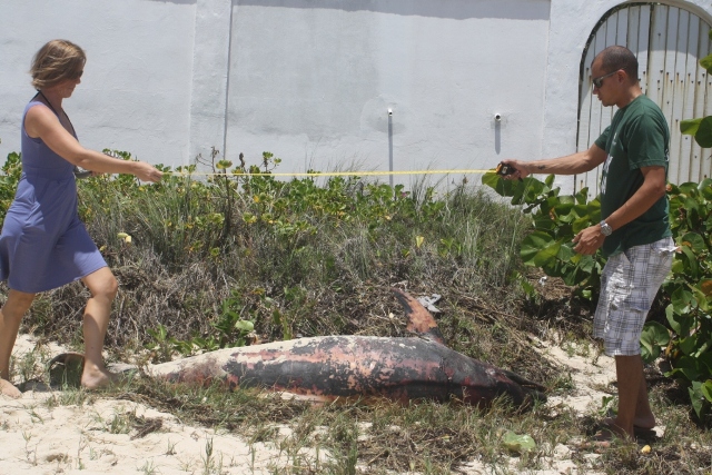On Sunday the 28th of April the St. Maarten Nature Foundation was alerted to reports of a stranded dolphin on Guana Bay Beach. Upon arrival at the reported location the Nature Foundation noticed one (1) large delphinidae in a medium to advanced stage of decomposition 3.2 meters from the high water line.