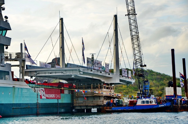 On Sunday, a critical stage was reached in the installation of the Swing Bridge. After removal of some sea fastening devices, preparation of skidding equipment, and the trimming of the Marietje Andrea, the operation started on Sunday at 2.00pm and was completed around 6.00pm the same day.