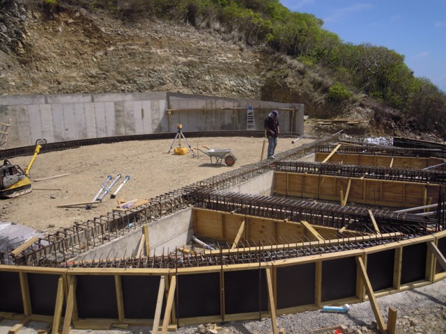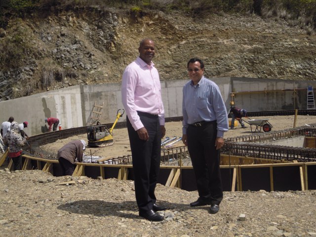 Minister of Public Health Social Development & Labor with responsibility for the production and distribution of drinking water, Cornelius De Weever on Monday May 13, 2013 visited the construction site in Pointe Blanche where two tanks for storage of drinking water will be built. The site is located uphill on the road to Monte Vista. A solid foundation with an impressive amount of reinforcing steel and concrete is being completed for the first tank. The retaining wall is already in place. The works for the construction of the foundation have been contracted out by GEBE to Liccom NV.