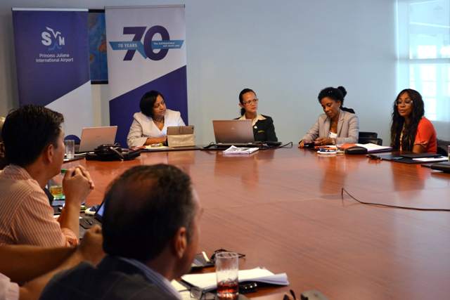 Photo caption: SXM Managing Director, Regina LaBega (head of table) listens attentively during the forum convened Tuesday to kick off the new study on air service maintenance and development. To Labega’s left are Suzy Kartokromo, acting manager, Marketing and Customer Service at SXM Airport, Silviane John of St. Martin Tourist Office, and Ines Choisy of St. Barths Tourism Bureau. With back to camera are SHTA President, Emile Lee (l) and Maho Group President, Saro Spadaro. (Photo courtesy SXM Airport)