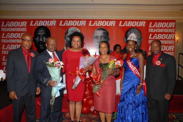Photo – (left to right) – Deputy Prime Minister and Deputy Political Leader, the Hon. Dr. Earl Asim Martin; Mr. Poesy Southwell; Mrs. Etsu Bradshaw-Caines; Ms. Prudence France; Ms. Vernecia Wyatt, Labour 2013; Prime Minister the Right Hon. Dr. Denzil L. Douglas