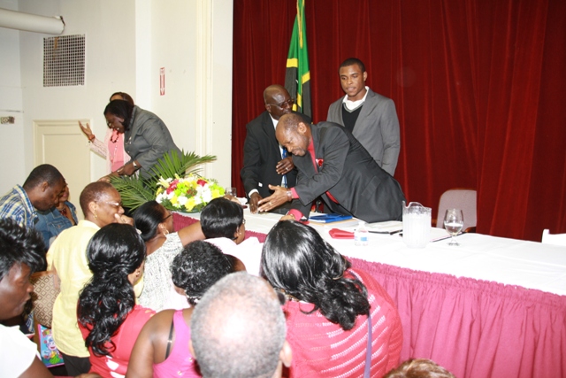 Photo 1 – Nationals greeting congratulting Prime Minister the Rt. Hon. Dr. Denzil L. Douglas after the meeting.