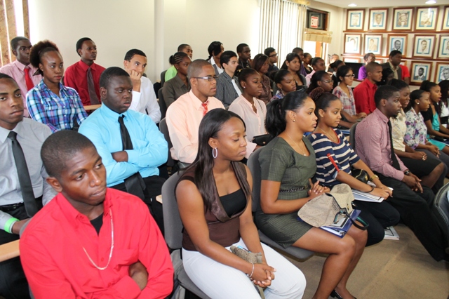 PHOTO CUTLINE: Students who took part in the BOPP training listen attentively to Minister of Education Hon. Patricia Lourens as she spoke to them on Friday prior to the certificate presentation. DCOMM Photo