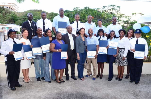 PHOTO CUTLINE: Some of the graduates at a recent cadet graduation ceremony on the compound of the Sint Maarten Justice Academy, proudly displaying their diplomas in the presence of the Prime Minister Hon. Sarah Wescot-Williams (front row 7th from left) and Minister of Justice Hon. Dennis Richardson (front row 6th from left). DCOMM Photo