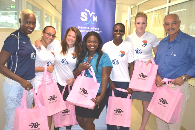Female athletes of the FC Soualiga Soccer team sponsored by the Princess Juliana International Airport (SXM), received their branded jerseys on Tuesday, October 15, 2013. They also received breast cancer promotional bags in light of the Breast Cancer Awareness Month currently underway.