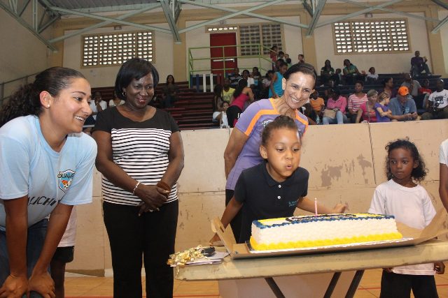 Photocaption: From left to right Oualichi Women’s Soccer Team Founder and Oualichi Women’s Soccer Association Danae Daal, Minister of Education, Culture, Youth and Sports Patricia Lourens Philip, and Prime Minister Wescot-Williams, watch Oualichi Girls Team Player Shirley Sadowski and Melissa Carty blow out the one year celebratory birthday cake.