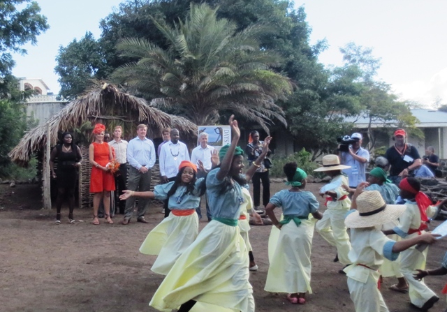 The King was going to open the exhibition by placing a branch of the flamboyant tree over the door of the reconstructed slave hut that is part of the exhibits. This refers to the traditional Statian way of celebrating Emancipation Day by decorating houses with these branches. This was also in the official program and script of the visit and the Royal couple was briefed accordingly. The children of the Historical Foundation’s youth club under the leadership of museum employee Misha Spanner had rehearsed their short rendition of Statia’s traditional emancipation song ("Happy July Day") that was going to end with two of the children handing the branch to the King.