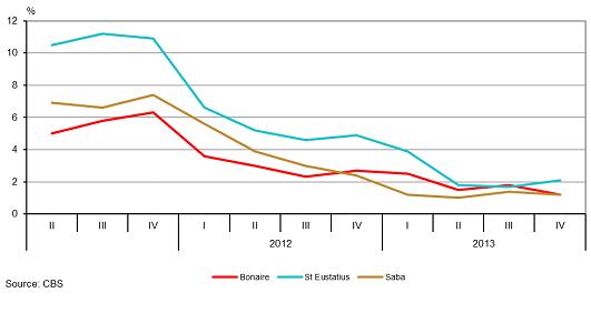 Bonaire’s inflation rate over the fourth quarter of 2013 was 1.2 percent, i.e. considerably below the level recorded in the third quarter. The inflation rate of 1.2 percent on Saba was also lower than in the third quarter, but the rate on St Eustatius increased substantially to 2.1 percent.