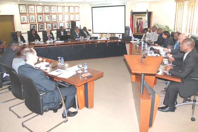 On Thursday the Council of Ministers met with representatives from the Central Bank of Curacao and Sint Maarten in the Dr. A. C. Wathey Legislative Hall. The President of the Central Bank Dr. Emsley Tromp, gave a presentation entitled, "The recent economic developments, future developments, monetary union and dollarization." After the presentation various Ministers posed questions.
